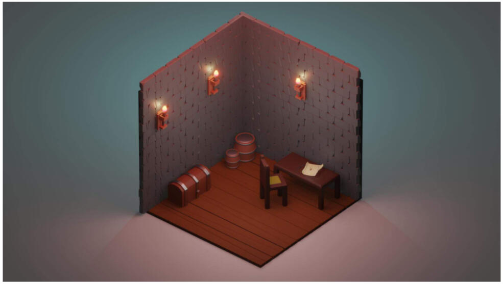 The room has brick walls and wooden floors. There are three flame torches on the walls that provide light and warmth. The main furniture pieces are a large barrel and a small barrel, a chair and a table, and a chest. The large barrel would be used to contains rum, the small barrel for water, and the chest would contain the crew's gold coins and jewels. The table has an open map on top, showing the x in the Caribbean islands. The chair has a cushion and a pillow for comfort. I tried to make the model as low poly as possible, without sacrificing the quality or the style.* Triangles: 56.5k